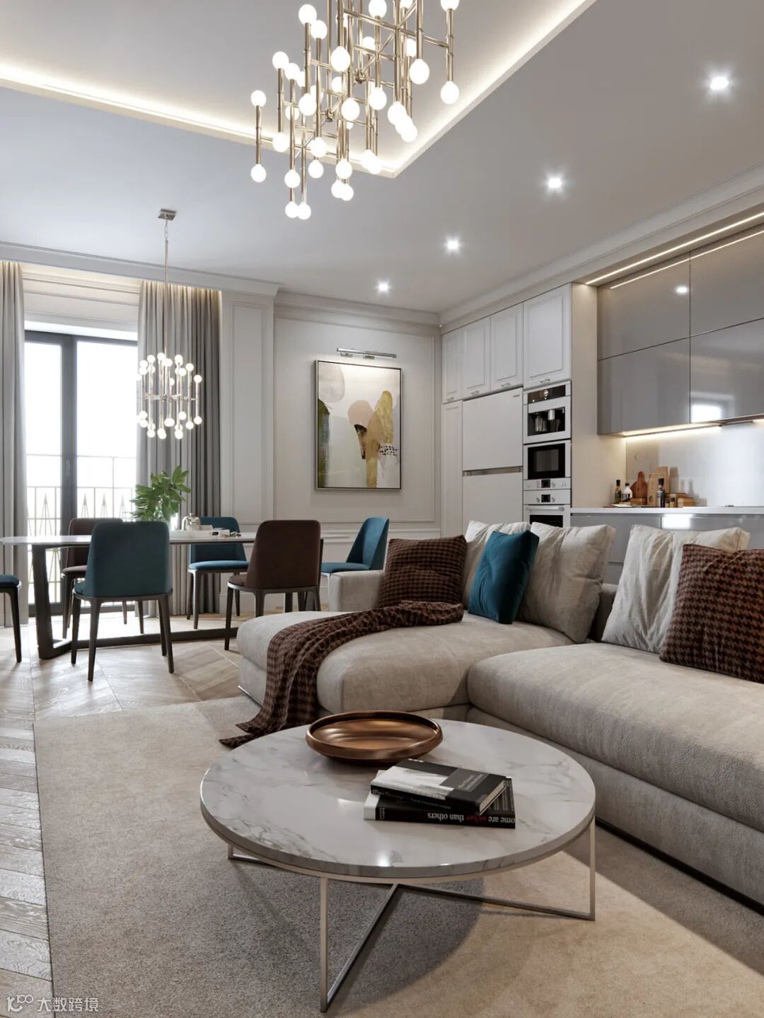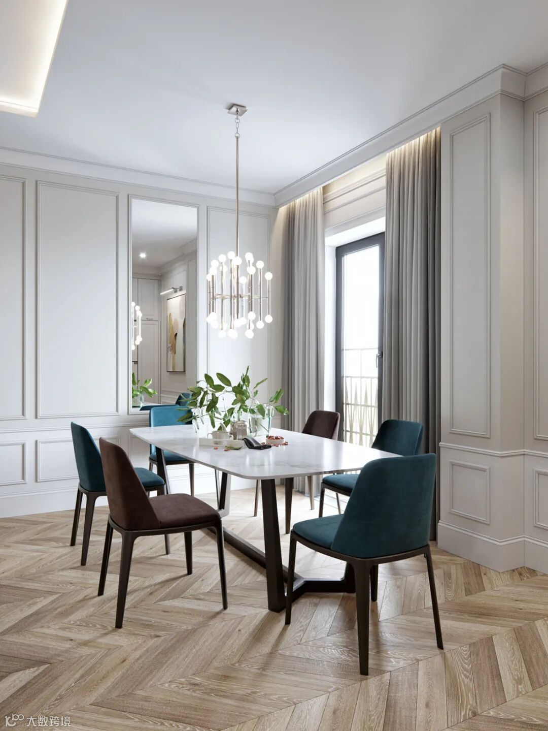 餐厅位于沙发侧面,极简的大理石台面餐桌,搭配了几把舒适简约的餐椅。