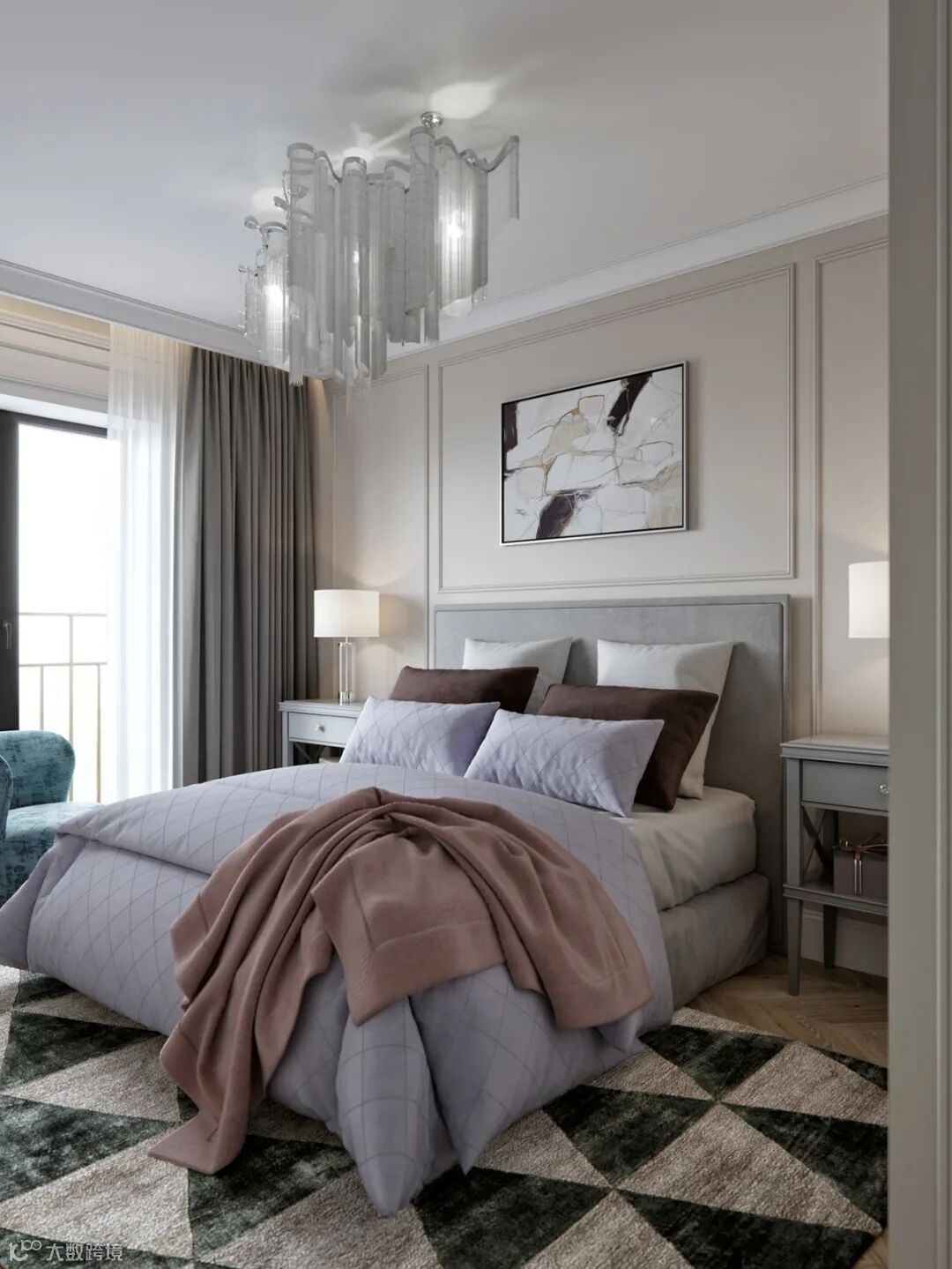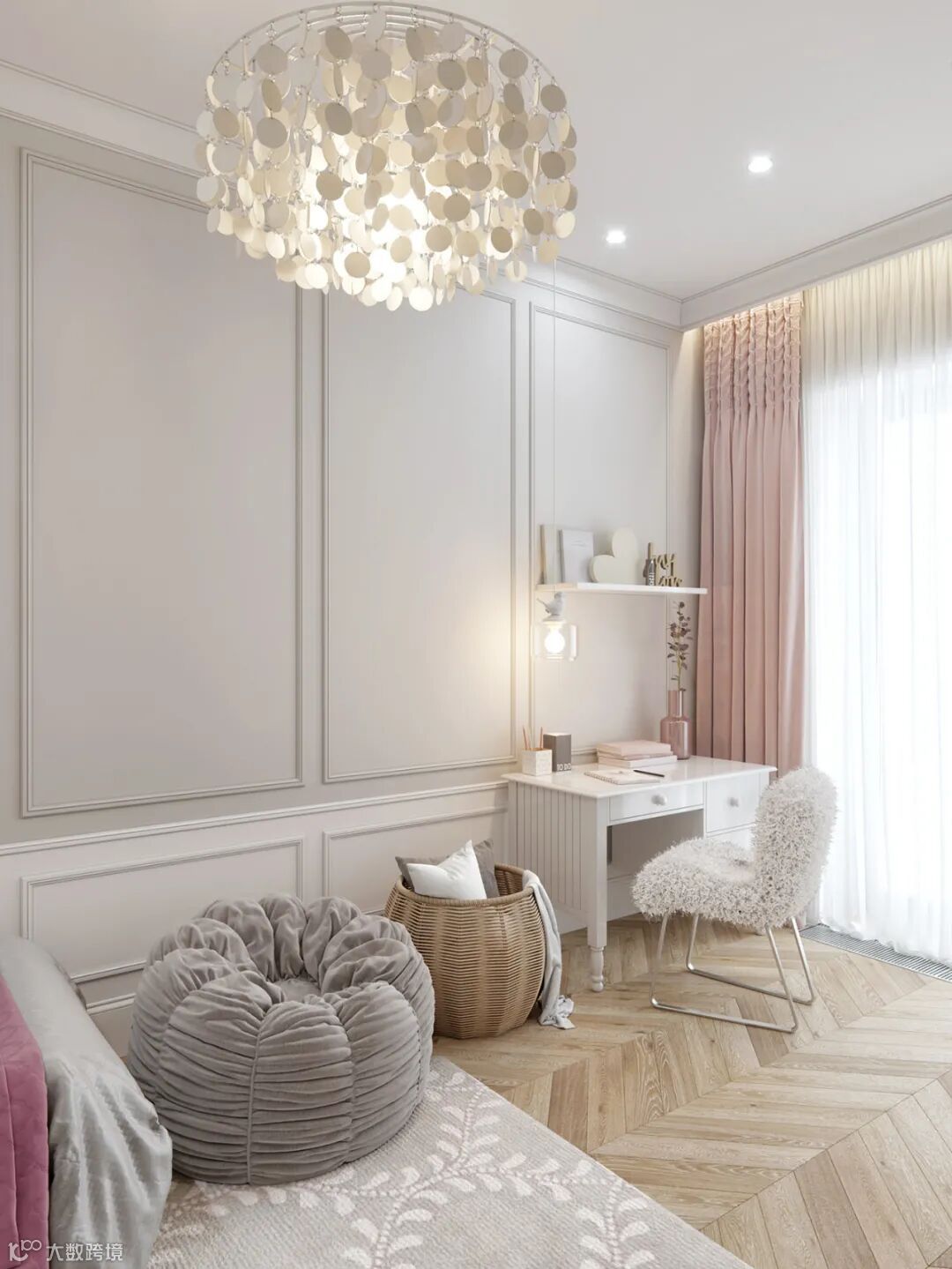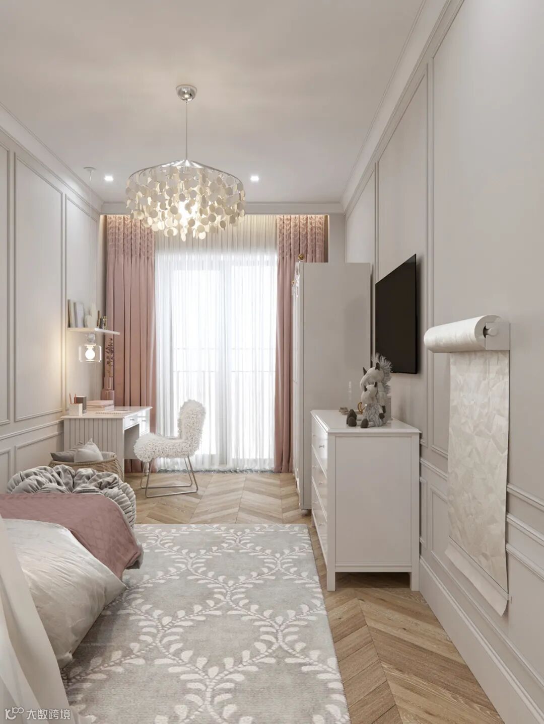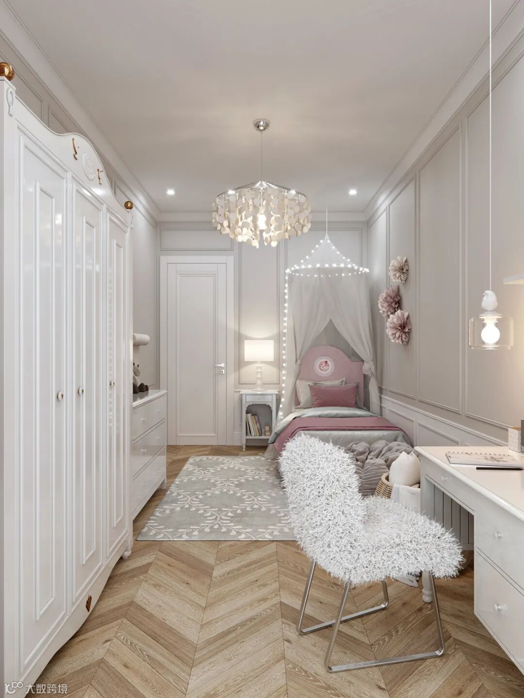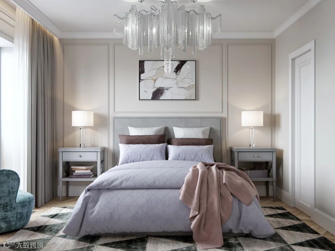 甫入卧房,温煦日光敞亮柔和气息,细腻雕花线板揉合简练古典饰板,整个空间干净又不失格调,沉淀出亲密岁月的质感。由于空间较小,用壁桌代替了床头柜,保证功能的同时又可以节省空间。