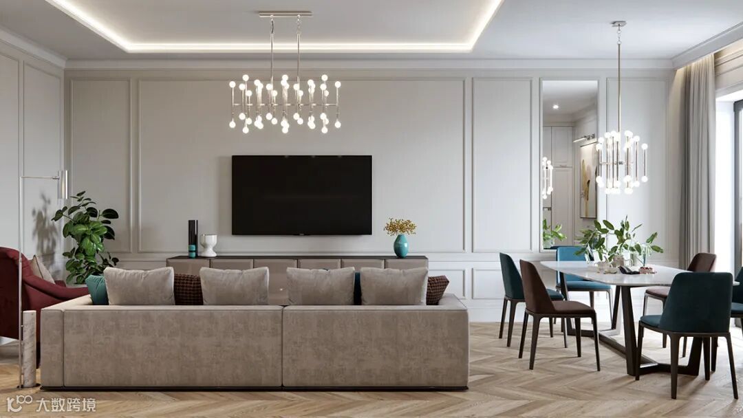 电视墙超级简洁,一个简单的落地柜,电视机直接挂在干净的墙上,没有其他视觉干扰。