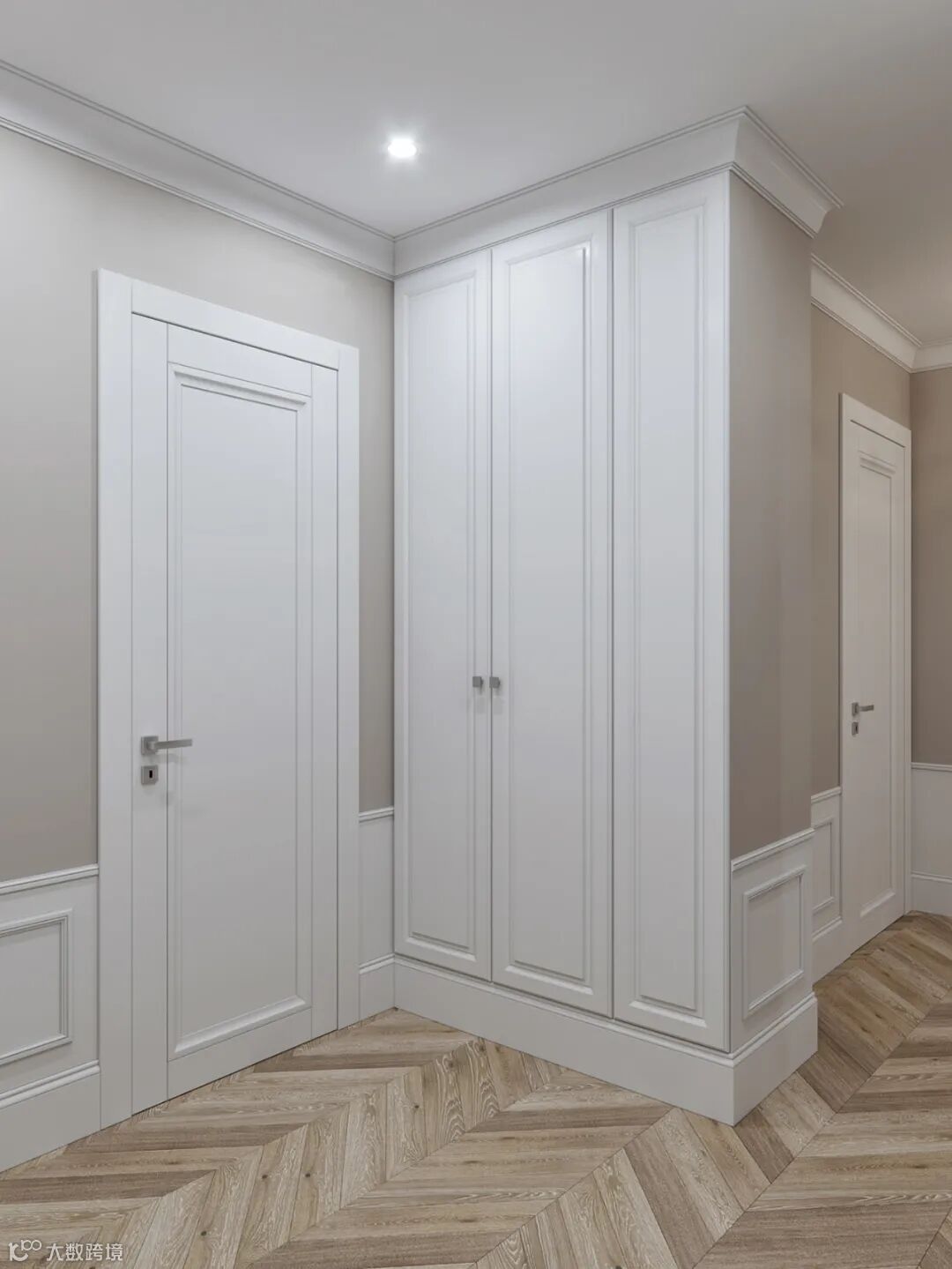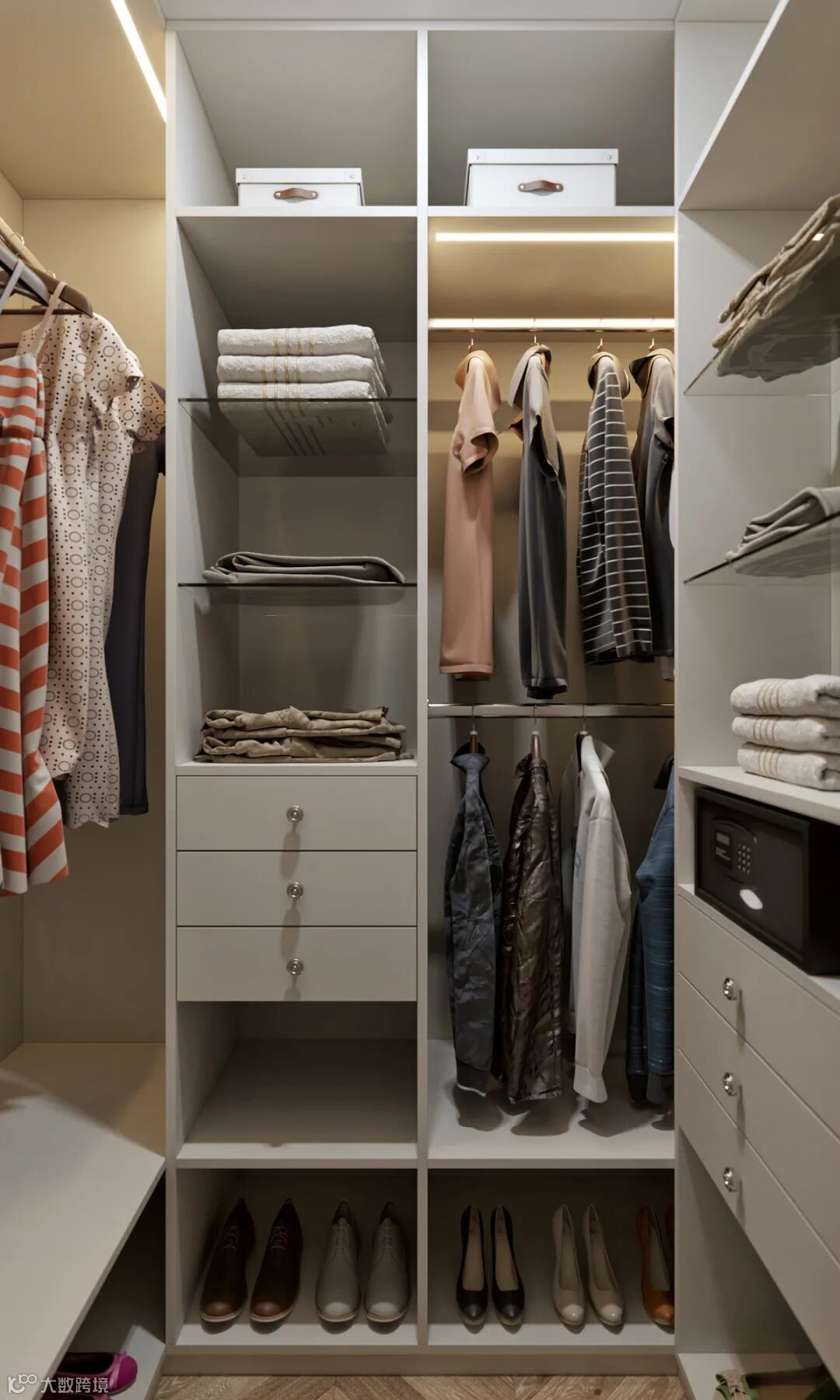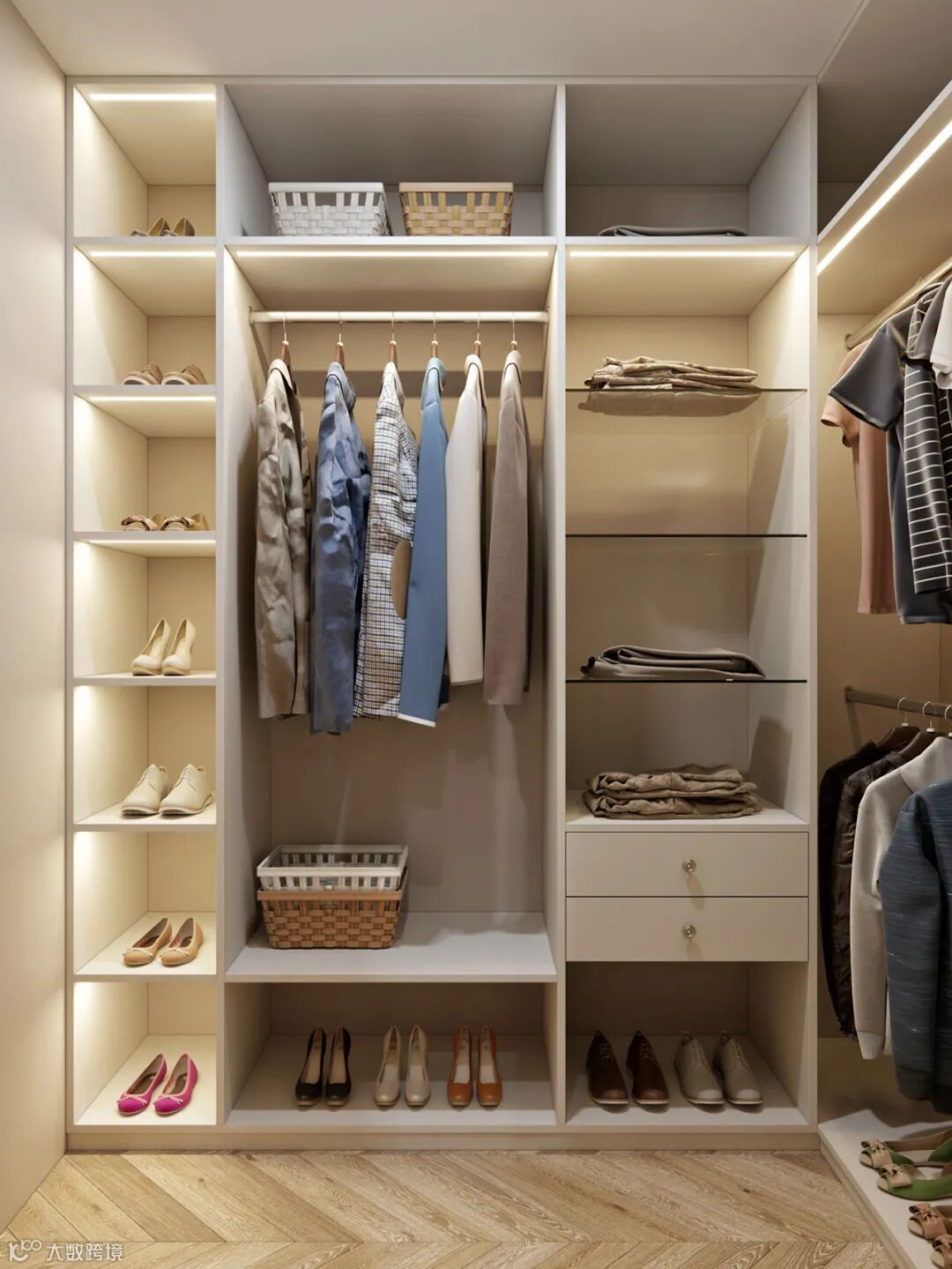 U型衣帽间有着很强大的收纳功能,实用性非常强,U型设计相较整排衣柜设计,更具人性化,从视觉和使用方面都更加舒适。U型衣帽间主要以的材料主要是挂衣通和层板,能够满足长短衣服的悬挂与叠放的需求。