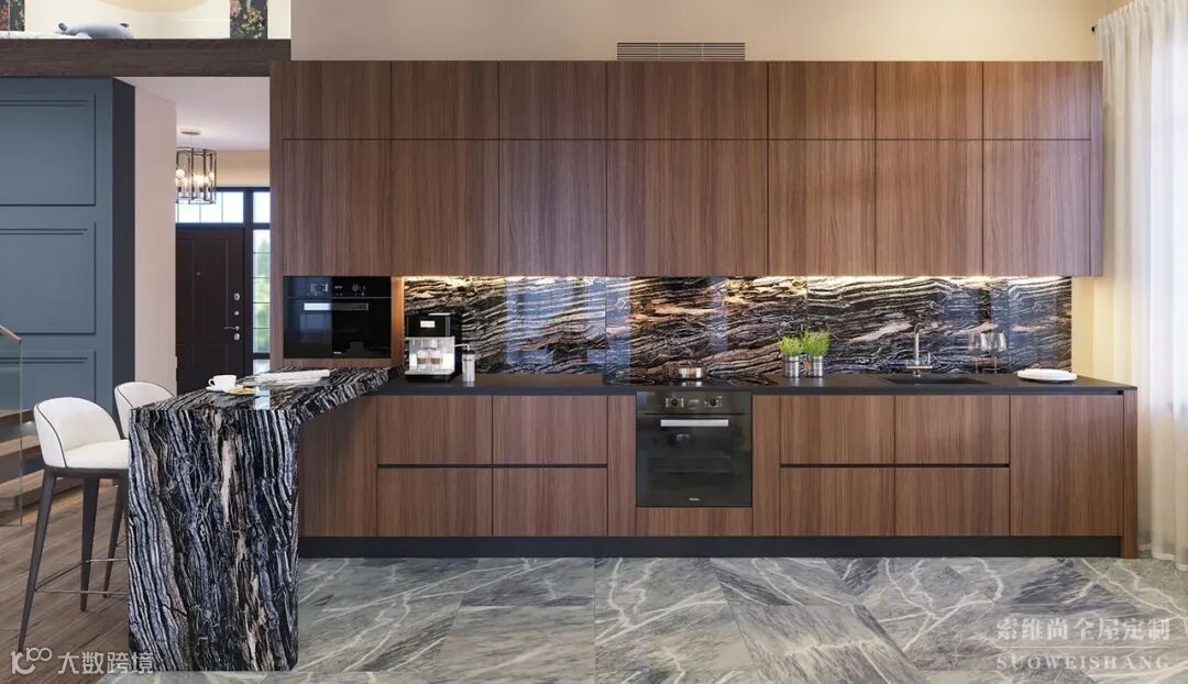 此空间采用一字型的橱柜布局,充分呈现了厨房柜体的优雅气息。