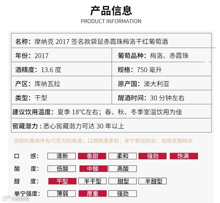 结构细腻,口感柔和优雅,收尾平衡悠长,窖藏潜力颇高