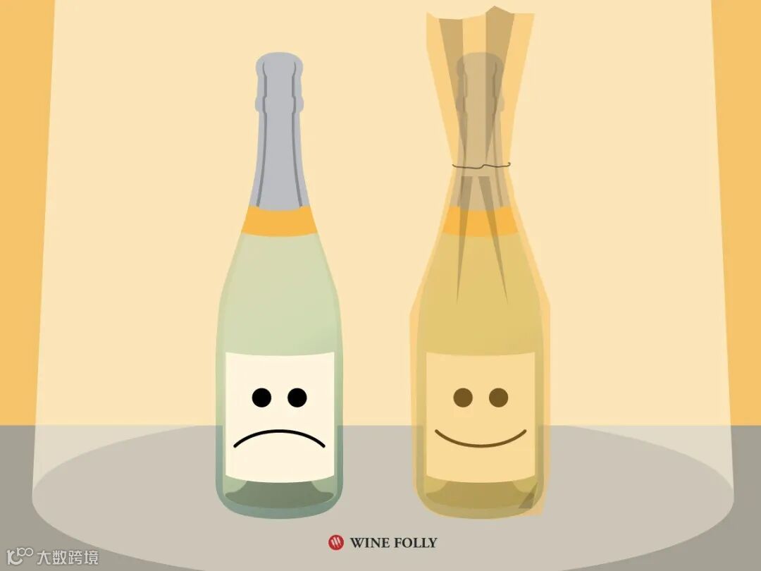 透明的酒瓶会导致难闻的酒味,闻起来像湿羊毛、旧大蒜或肮脏的排水管。这种变质是由一种叫做二甲基二硫化物(DMDS)造成的,当葡萄酒暴露在光(人造光和阳光)下长达60分钟时就会发生(这种变质被称为 光变质)。这意味着所有那些卖酒的商店陈列的透明玻璃瓶的桃红,气泡和白葡萄酒很有可能已经变质了。