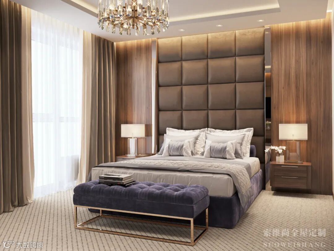 卧室整个地面被完整铺上花纹地毯,英伦绅士的配色与方格,浮雕版立体质感。