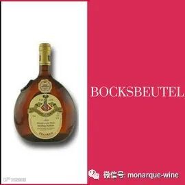 Bocksbeutel翻译过来是“啤酒袋”,但它是用来装葡萄酒的。它的形状是扁平的椭球体,和其他瓶子的容积相同(0.75升)。它有一个短脖子,常见特征是一个在左肩浮雕徽章。这个徽章通常代表它的产区。这个瓶子被制造成扁平的形状是为了便于携带,并且防止它在倾斜地面上滚走。