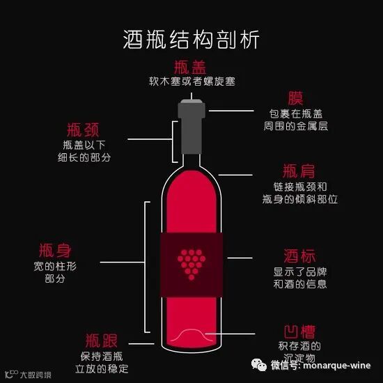 酒瓶通常由玻璃制成,有各种形状和容积。这些瓶子不仅仅是容器,它们透露了许多只有葡萄酒专家才能解释的关于葡萄酒的细节。所有的酒瓶都根据它们所装的红酒品种而具有特定的结构。酒瓶的各个部分都有特定的含义。首先,让我们看看这些部分的名称。