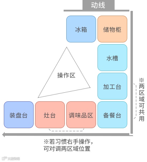 空间不是很大的话,L型的布局最能节省空间。工作区以墙角为原点,双向展开成L型,避免一条边过长,否则会压缩操作区面积,降低做饭效率