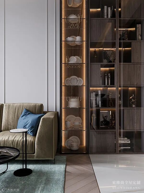 定制到顶的玻璃展示柜,既有展示的功能又有丰富的储物格设计。很强大的收纳功能,使得客厅显得更加整齐大方。