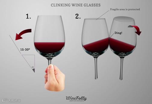 喝葡萄酒时碰杯是一项必不可少的礼仪。在中式的饭局中最常见的就是碰杯,其实在西式宴会上也是如此,推杯换盏,在酒杯清脆的碰撞声中友情渐增。