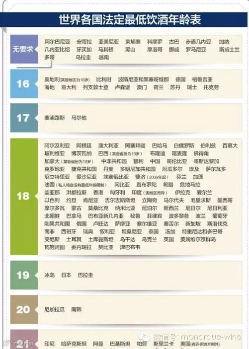 全球平均最低的法定饮酒年龄为15.9岁,其中大多数国家规定的最低饮酒年龄为18岁。根据世界卫生组织的统计,全世界人首次饮酒的平均年龄为12岁,大约有80%的年轻人会在15岁或更年轻的时候开始定期饮用酒精饮料。