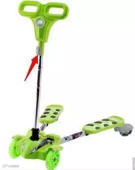 行驶滑板车时,检查调节杆处是否锁紧,防止骑行中突然脱开或失效,造成儿童摔跤的风险。
