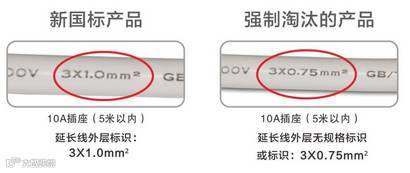排插的延长线在安全方面重要性毋庸置疑。新国标特别将线材的规格做了提高,10A插座延长线线芯不得小于1.0mm²,消费者可查看排插外包装是否对延长线线芯规格作了说明,或者直接看延长线的文字标识。
