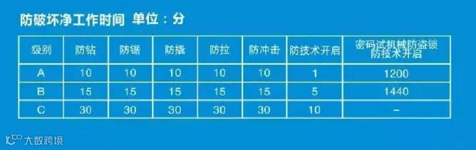下图为锁的防破坏净工作时间表。使用规定的工具对机械防盗锁实施防钻、防锯、防撬、防拉、防冲击、防技术开启实验和密码式机械防盗锁防技术开启实验,锁被破坏、被打开的净工作时间应不少于下表的规定。