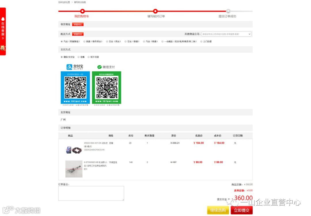 新建收货地址并保存。设为默认并点击前面确认选中,审核收货地址并且选择配送方式、支付方式、挂账客户不用付款、点击前面确认挂账,确认无误后,点击“立即支付”’订单提交成功,原跟 进业务马上收到此单当日出货!