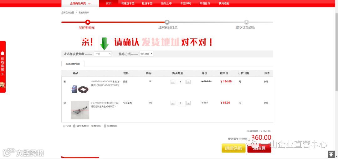 点击上图的立即构面按钮,进入到购物车页面审核规格、库存、价格和数量。点击可以修改购买产品的数量,暂不需要产品取消打勾或删除,其他产品确认无误后点击结算