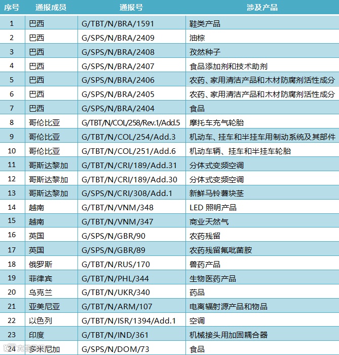 2025年5月6日,共有12个WTO成员通报了24项技术性贸易措施,其中14项为TBT措施,10项为SPS措施。通报情况为:巴西7项、哥伦比亚3项、哥斯达黎加3项、越南2项、英国2项、俄罗斯1项、菲律宾1项、乌克兰1项、亚美尼亚1项、以色列1项、印度1项、多米尼加1项。这些措施涉及鞋类产品,孜然种子,食品添加剂和技术助剂,食品添加剂和技术助剂,分体式变频空调,LED照明产品,商业天然气,农药残留,药品,食品等。通报详情如表1所示。
