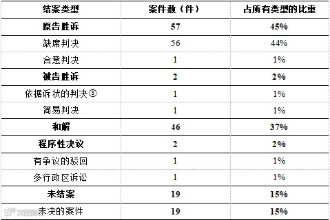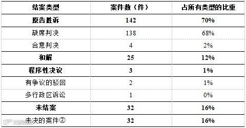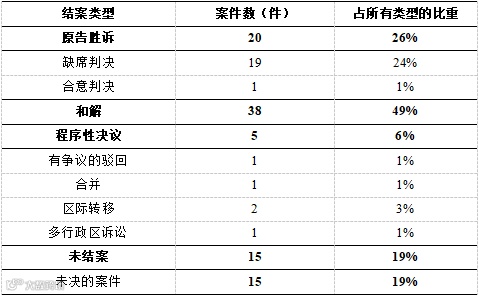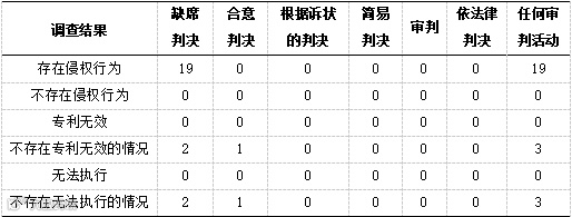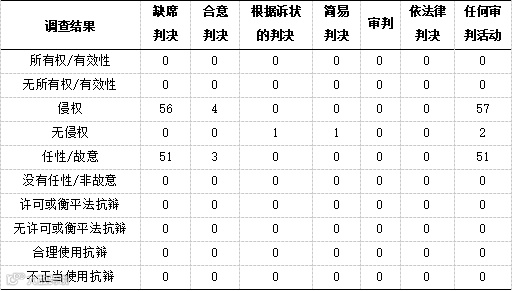 商标调查结果中认定存在商标侵权、虚假原产地标识、抢注、恶意行为的判决以缺席判决为主,其余少部分集中在合意判决。版权调查结果中认定存在版权侵权、恶意行为的判决以缺席判决为主,少部分集中在合意判决;少数认定不存在侵权行为的判决集中在根据诉状的判决和简易判决。专利调查结果中认定存在侵权行为的判决以缺席判决为主,没有案件被认定不存在专利侵权行为。