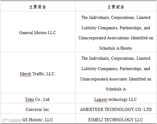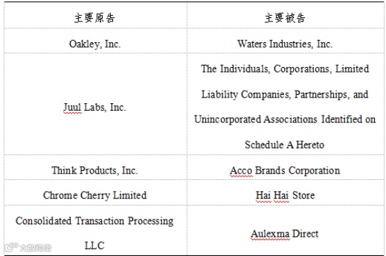 Pacold法官审理的知识产权诉讼案件主要集中在商标、版权与专利领域。其中,商标诉讼案件的原告主要集中在汽车公司、设计公司、动画制作公司、制鞋公司、电子烟公司等,被告主要集中在外贸公司或电商企业。版权案件的原告主要集中在影视或动画制作公司、奢侈品品牌、艺术家或个人工作室,被告主要集中在电商企业。专利案件的原告主要集中在运动装备公司、电子烟公司、设计公司等,其中部分原告为NPE(Non-Practicing Entity,非专利实施主体);被告主要集中在水流控制产品制造公司、办公用品制造公司、电商企业等。值得注意的是,知识产权诉讼案件中有较多被告以附表A(Schedule A)形式出现。