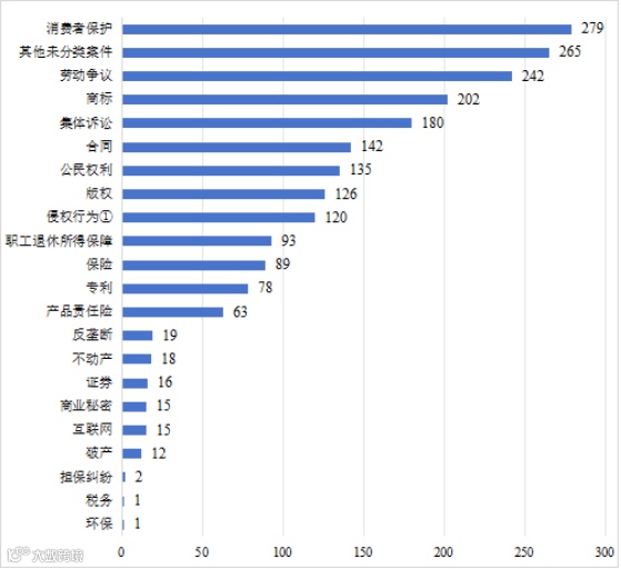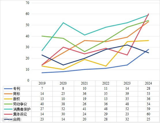 2019年至2024年间Pacold法官审理的案件类型主要集中在消费者保护、劳动争议、商标、集体诉讼等领域,其中审理的消费者保护案件最多,高达279件。商标案件量总体呈上升趋势。²