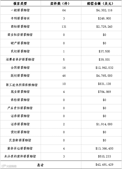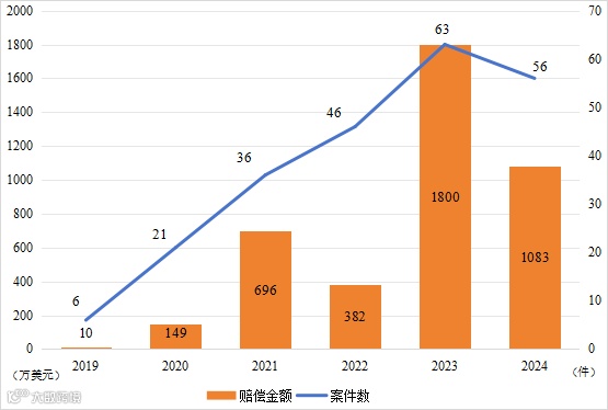 Pacold法官判决的案件中涉及商标赔偿案件数量最多,达131件,赔偿金额共计272.92万美元;涉及版权案件46件,赔偿金额共计476.5万美元;涉及专利案件3件,赔偿金额共计24.99万美元;涉及集体诉讼案件的赔偿金额最高,4件集体诉讼判赔案件共计赔偿金额约1336.64万美元。值得注意的是,诉讼判赔案件数量自其上任以来持续稳定上升,到2023年达63件,判赔金额达1800万美元,2024年轻微回落。