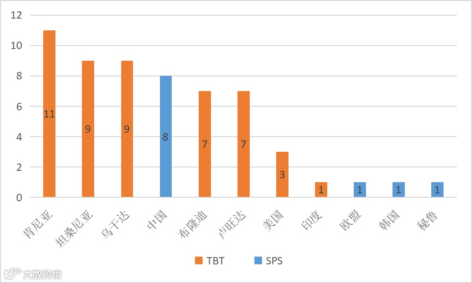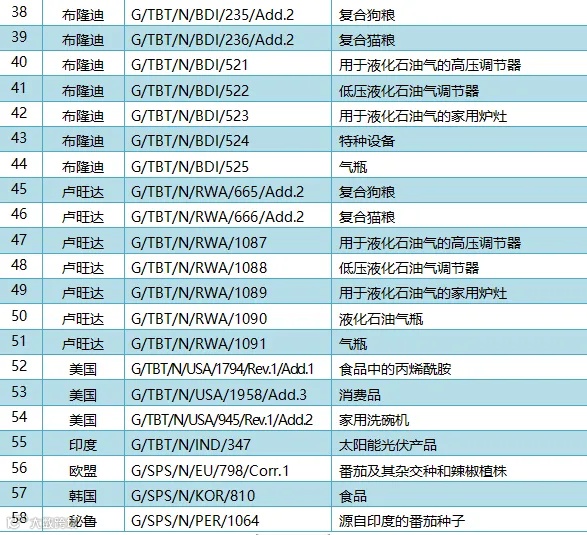 2024年10月18日,共有11个WTO成员通报了58项技术性贸易措施,其中47项为TBT措施,11项为SPS措施。通报情况为:肯尼亚11项、坦桑尼亚9项、乌干达9项、中国8项、布隆迪7项、卢旺达7项、美国3项、印度1项、欧盟1项、韩国1项、秘鲁1项。这些措施涉及复合狗粮,用于液化石油气的高压调节器,特种设备,气瓶,食品干燥机,与食品接触的材料,有机肥料,食品添加剂,灭菌乳,消费品,家用洗碗机,太阳能光伏产品,食品等。通报详情如图表所示。