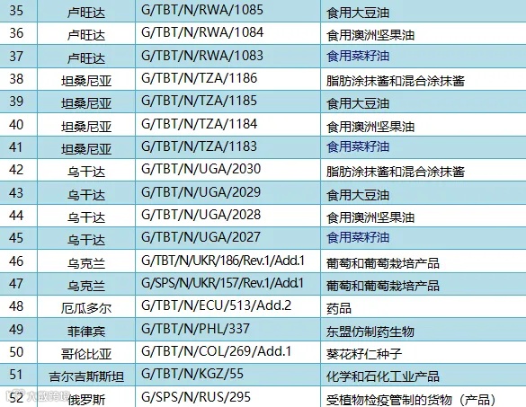 2024年10月14日,共有13个WTO成员通报了52项技术性贸易措施,其中29项为TBT措施,23项为SPS措施。通报情况为:巴西18项、肯尼亚6项、加拿大5项、布隆迪4项、卢旺达4项、坦桑尼亚4项、乌干达4项、乌克兰2项、吉尔吉斯斯坦1项、哥伦比亚1项、菲律宾1项、厄瓜多尔1项、俄罗斯1项。这些措施涉及农药、家用清洁产品和木材防腐剂活性成分,畜产品,食用大豆油,无线电设备,辐射发射装置,药品,化学和石化工业产品等。通报详情如表所示。