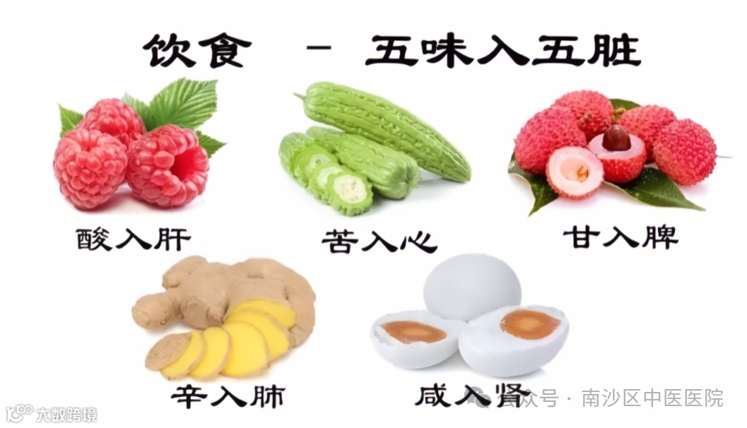 中医认为,食物有五味:酸、苦、甘、辛、咸,分别对应人体的五脏:肝、心、脾、肺、肾。