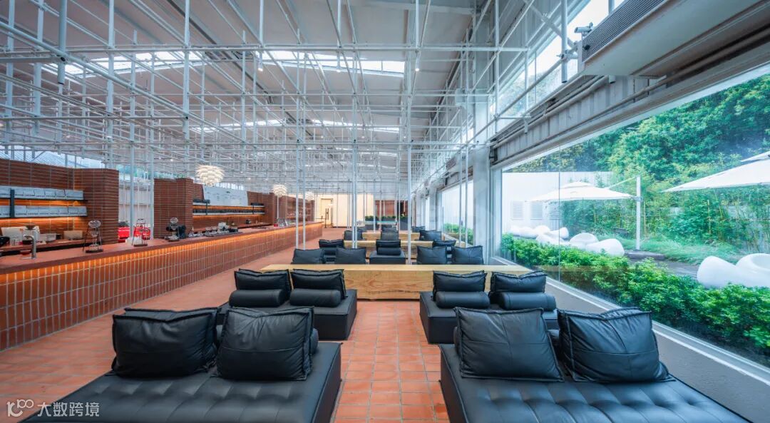 咖啡品尝区八米长的整木桌是整个空间的视觉焦点,每一张木桌便是一整棵树定制而成,坚硬而粗粝的触感,与黑色皮质的柔软沙发形成材质的对话。整面的落地玻璃幕墙将室外绿意温柔引入,光影斑驳间,工业的硬朗与侘寂的清净在此达成完美的和谐。