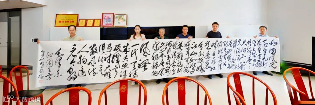 近日,一群艺友围着一幅长8米、宽1.1米的《沁园春·雪》草书作品,热热闹闹地送到了广州每益鲜商品供应有限公司。