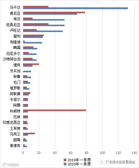 2020年一季度(1月1日至3月31日,下同),在WTO的164个成员中共有64个WTO成员提交了956件TBT通报,其中包括589件技术法规和合格评定程序的新通报、10件修订通报、357件补遗和勘误通报,通报数量同比增长36.6%,通报数量前十位的成员贡献了89.9%的TBT通报数增长量。提交通报数量位列前10位的成员依次是:乌干达、美国、巴西、肯尼亚、坦桑尼亚、埃及、卢旺达、印度、欧盟、智利(详见表1)。