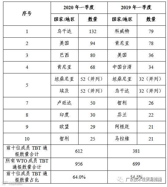 表1 2020年一季度和2019年一季度TBT通报数量前10位的成员列表