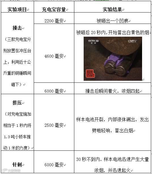 工业和信息化部电子第五研究所,通过模拟重物撞击、挤压等环境进行现场测试,发现撞击、挤压、针刺等行为都可能使充电宝发生冒烟甚至起火。