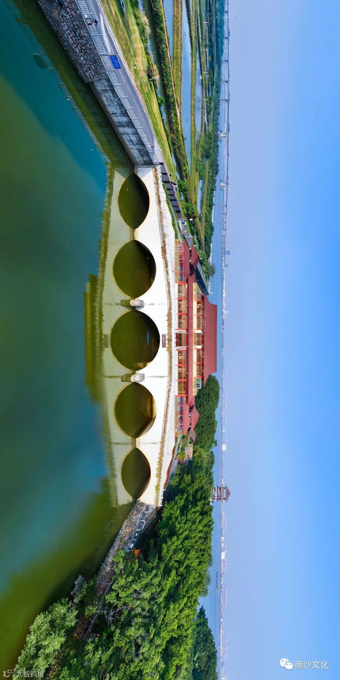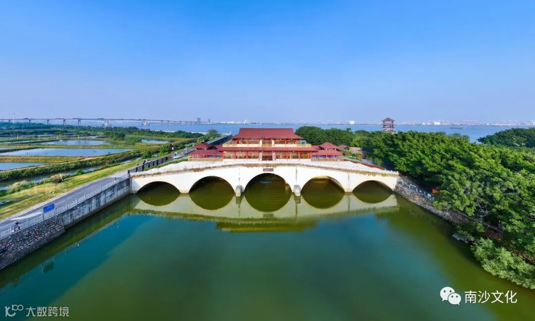 南沙湿地景区,四季如画,草木繁盛。作为南沙湿地新八景之一,廊桥寻梦项目坐落在十八涌上,直面伶仃洋。廊桥凌空飞架,由闸、桥、亭组成,似长虹饮涧,如新月出云。桥面以岭南风格建筑物为主体,外观采用五孔拱桥造型。独有的岭南建筑风格和自然的湿地生态景致交相辉映,浩瀚的伶仃洋与古典建筑相映成趣,充分展示着廊桥的历史文化和中国古典园林隐逸幽静之美。十八涌廊桥原为新垦十八涌东堤水闸,闸桥总长82.4米,宽26.3米,用于防汛、抗旱、调节十八涌水道水流流量及水位使用。保存良好的结构风貌和优越的地理位置,为廊桥的改造利用增添底色,项目建设改造致力于将十八涌廊桥打造成为一个集防洪功能、自然景观、水情研究、休闲旅游于一体的水闸廊桥。