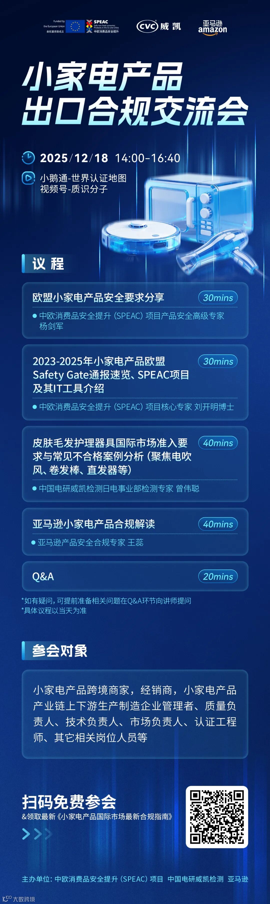 近年来,我国小家电行业依托完善的产业链与扎实的创新能力,在全球市场持续深耕,展现出强劲韧性。与此同时,鉴于小家电直接关系到消费者的日常使用安全,各国对其法规要求不断升级与细化,涉及电气安全、能效、环保及无线认证等方面,跨境电商平台审查也日趋严格。企业若未能充分掌握目标出口市场的相关监管体系、法规动态及最新标准要求,或将影响产品正常销售,造成不必要的损失。