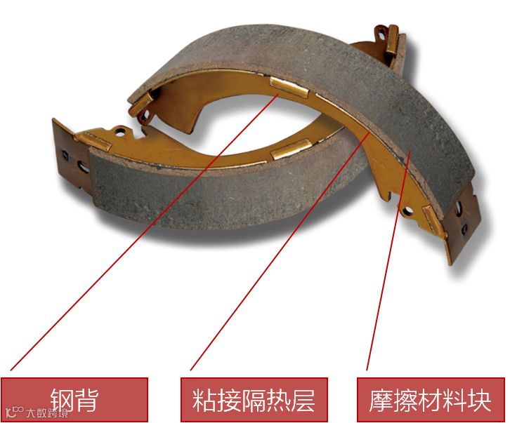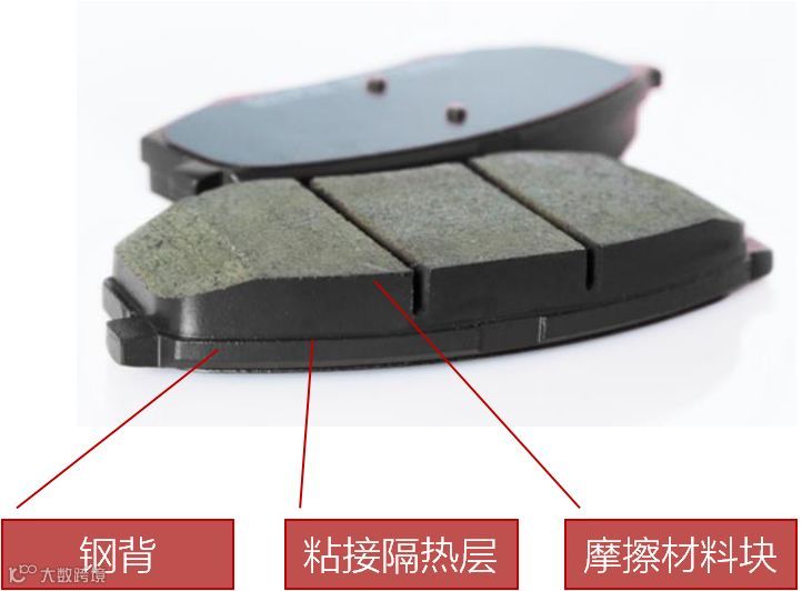 刹车片(brake lining)一般由钢背、粘接隔热层和摩擦块构成,其中起关键作用的是摩擦材料块——刹车时被挤压在刹车盘或刹车鼓上产生摩擦,从而达到车辆减速刹车的目的