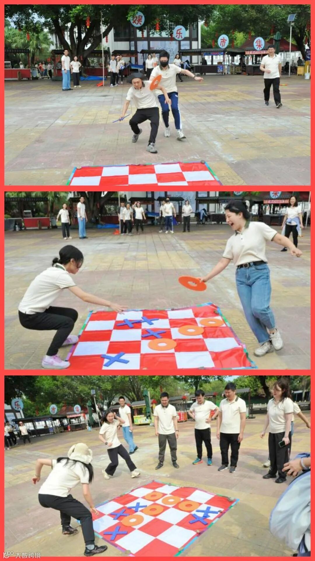 比赛过程中,双方各持一种颜色的4个道具,开始前双方自行在起点后排成一列纵队,裁判发令后,排头队员即可前往棋盘处放置道具,放完后返回起点与第二名队员击掌接力,并排在队尾,依次进行,最先将道具连成一线的队伍获胜。