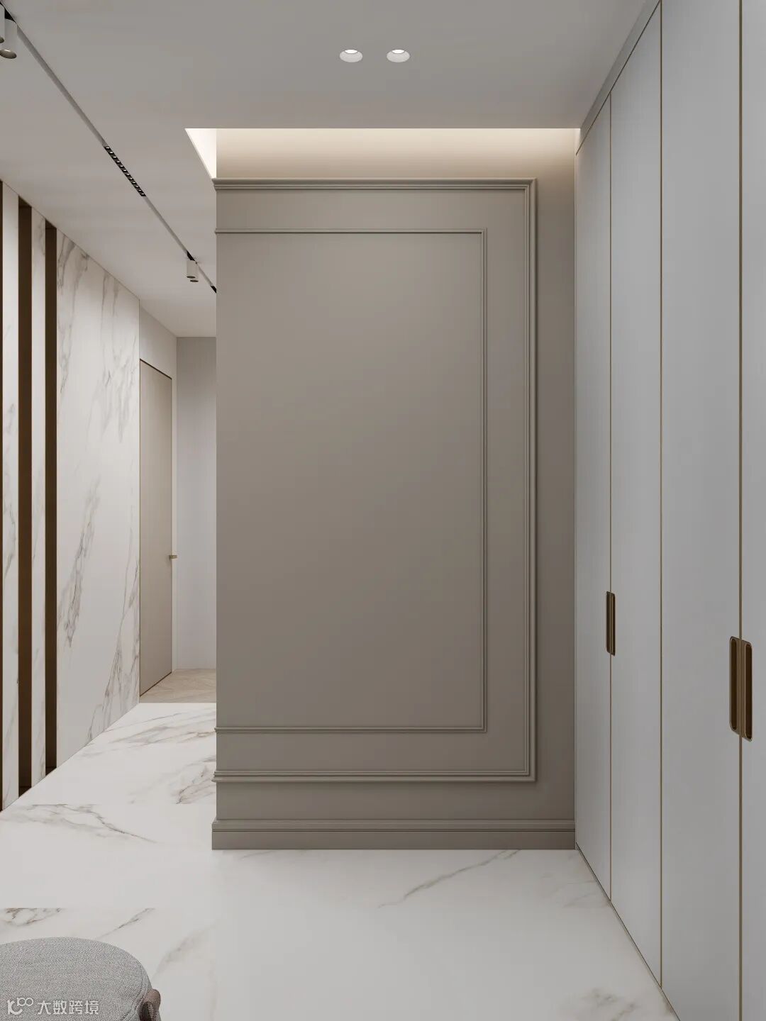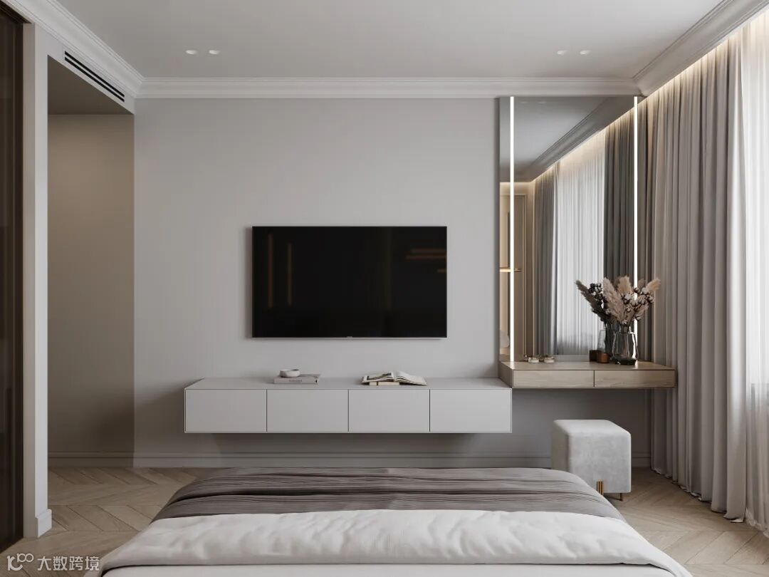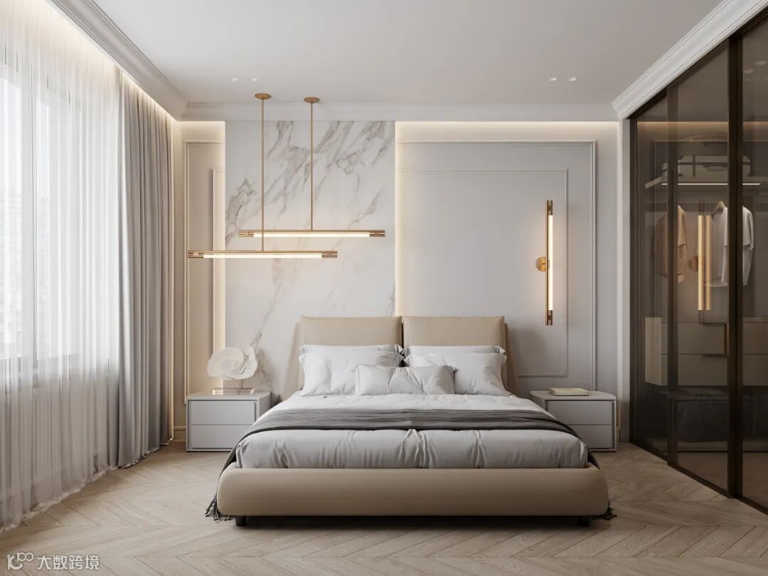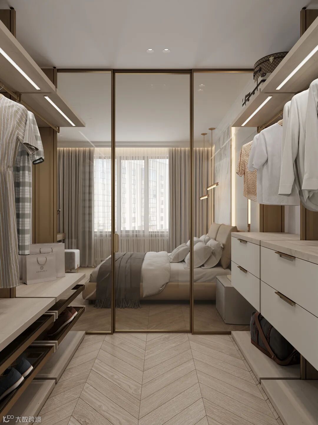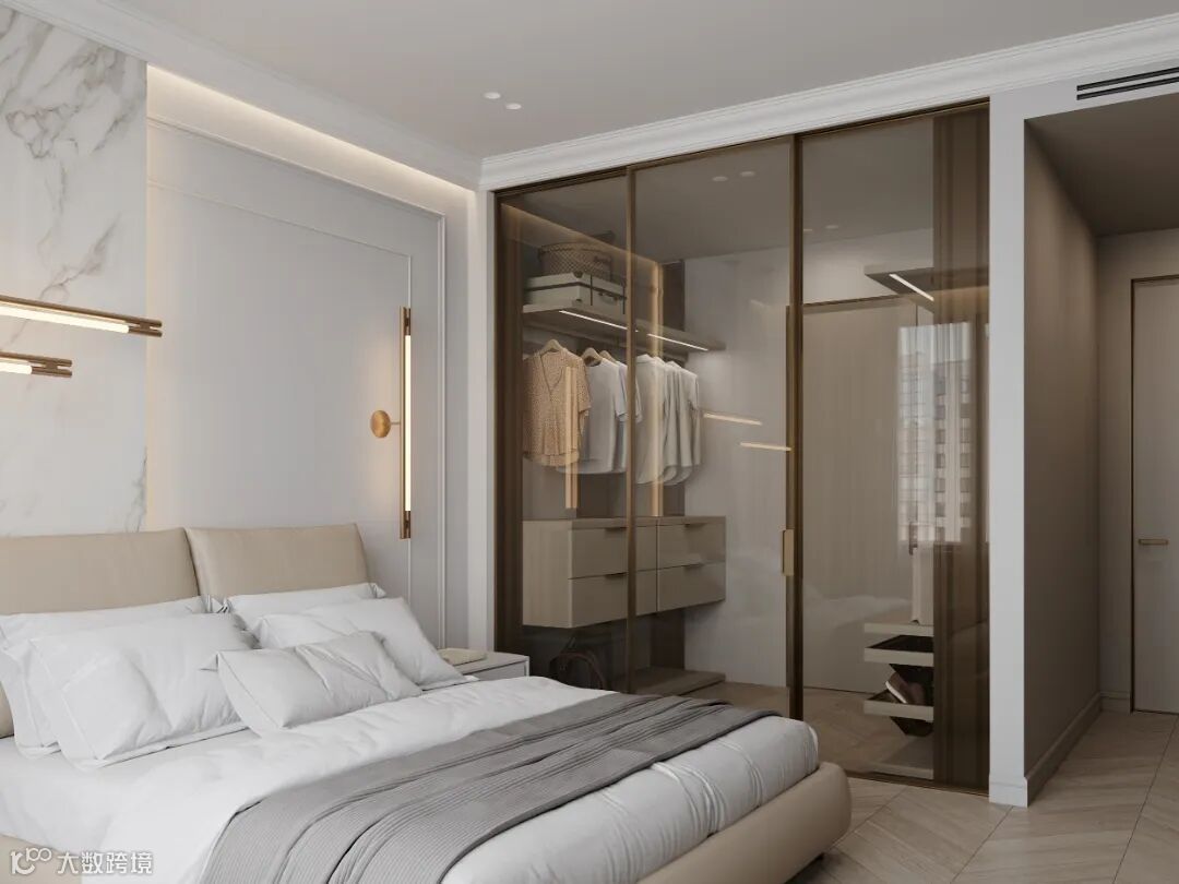 主卧采用套房设计,敞阔尺度将家的温度尽敛其中。步入式衣橱,香槟色玻璃门让空间愈发有韵味和调性,通透的视野也没有丝毫阻挡。
