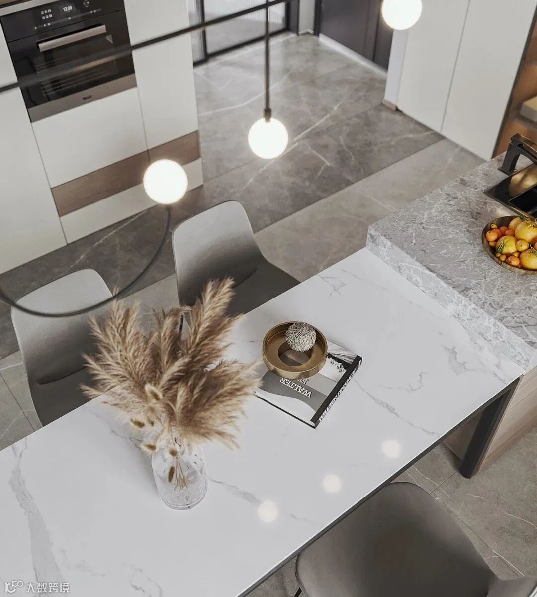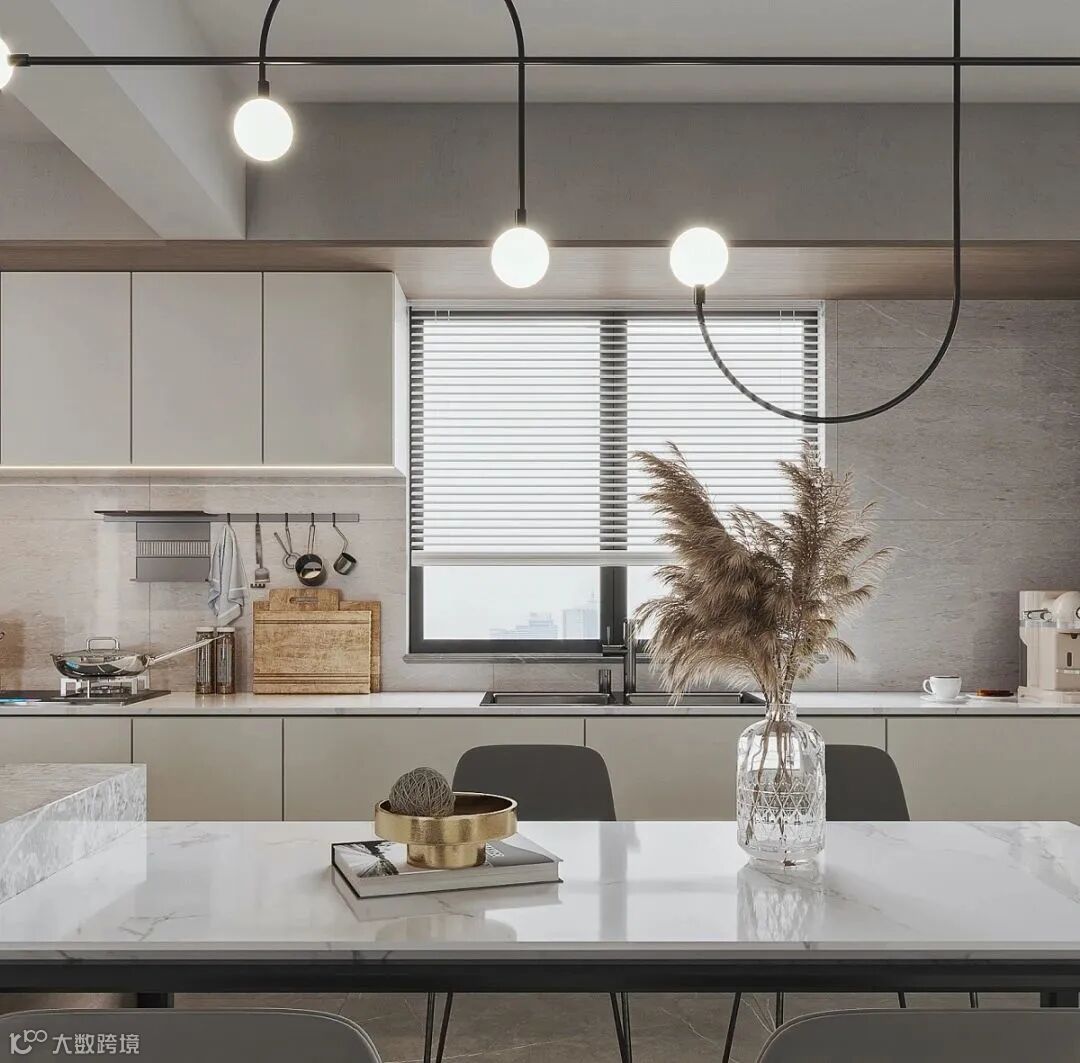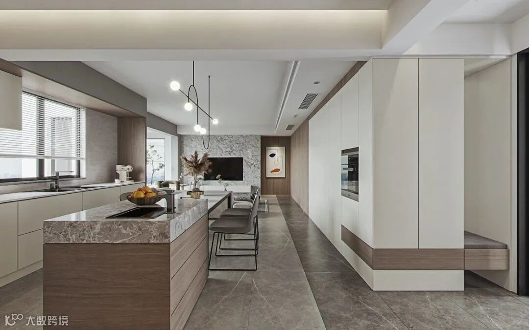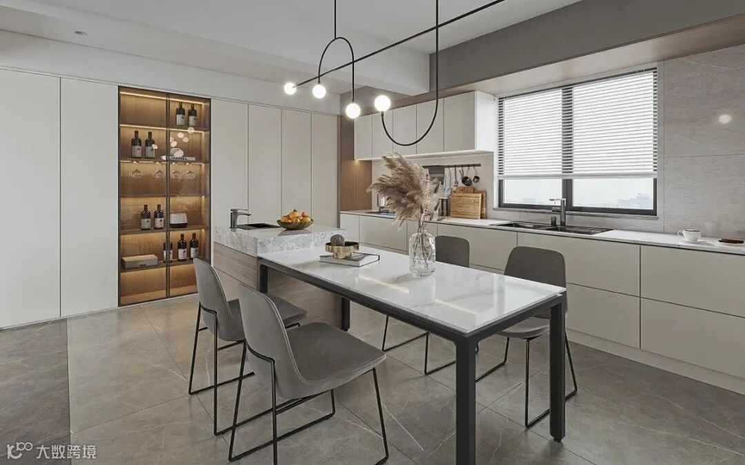 餐厨一体,连接了空间,整体更协调,定制橱柜与餐桌设计相呼应,采用白色的柜门,平面无拉手的门板,简约更具美感,加以大理石点缀,彰显与众不同,展现空间的艺术之美。