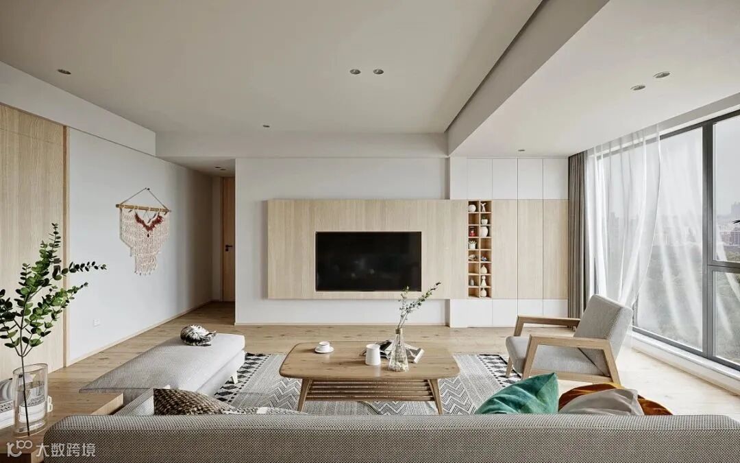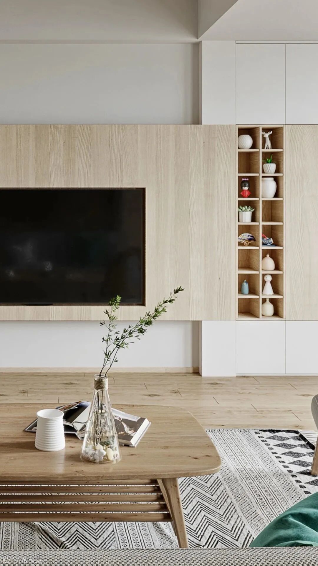 原木与留白恰到好处的比例,使得电视背景墙不仅造型别致,功能也趋于多元化。适当的开放式展示架为空间增添了层次感与轻盈感,摆放心爱的饰品书籍等,赋予家灵动多变的空间效果。