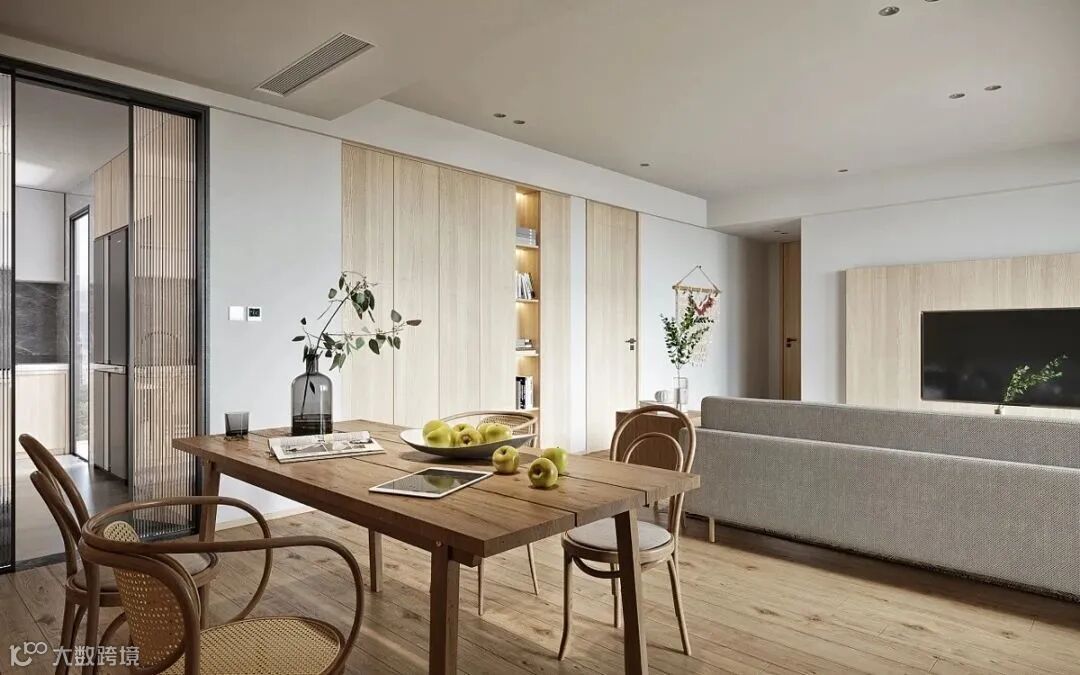 客厅与餐厅联通,白色与木色营造的简约空间,让安谧的舒适感萦绕于整屋之中。简单的木质餐桌椅,便承载着三餐四季的温馨。