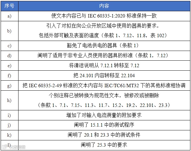 2021年11月3日,国际电工委员会发布标准IEC 60335-2-49:2021《家用及类似用途电器-安全-第2-49部分:食物和餐具保温用电动商用器具的特殊要求》。IEC 60335-2-49:2021标准以IEC 60335-2-49:2021 RLV标准形式提供,包含国际标准及其红线版本,内容显示了与前一版本相比对技术内容的所有变更内容。 IEC 60335-2-49:2021涉及用于维持食物和餐具恒温的电动商用器具的安全,对于连接一条相线和中性线的单相器具,其额定电压不超过250 V,其他器具不超过480 V。 属于该标准范围内的器具举例如下:带有或不带加热顶盖的食品保温柜;加热顶盖;保温展示柜;餐具保温机;加热餐桌;辐射加热器。 这些器具不适用于家用及类似用途,它们用于商业用途里的食品加工,也用于向公众开放的区域,例如餐馆、食堂、医院的厨房以及面包店和屠宰场等商业实体。该标准还包括使用其他形式能源的器具的电气部分。在切实可行的范围内,该标准处理涉及的是这些类型器具引起的常见风险。 值得注意的是: ●对于供车辆、船上或飞机上使用的器具,可能需要满足附加要求; ●在许多国家,国家卫生当局、负责劳工保护的国家当局、国家供水当局及类似当局也规定了额外要求; ●对于压力器具,许多国家可能规定了附加要求。 该标准不适用于: ●专供工业目的设计的器具; ●供特殊环境下使用的器具,如存在腐蚀性或爆炸性气体(灰尘、蒸汽或气态物)的场所; ●用于连续、大量地生产食品的器具; ●商用电水浴保温器(IEC 60335-2-50); ●电池供电的设备; ●非专业人员在以下环境中使用IEC 60335-2-12标准涵盖的家用保温板及类似器具的情况,以下环境指:商店、办公室和其他工作环境中的员工厨房区域、农舍、旅馆、汽车旅馆和其他住宅类型环境、民宿等。 该第五版标准IEC 60335-2-49:2021构成了技术修订,取消并替代了2002年第四版标准IEC 60335-2-49:2002,修订版标准IEC 60335-2-49:2002/AMD1:2008和修订版标准IEC 60335-2-49:2002/AMD2:2017。与上一版标准相比,该版本标准包括以下重大技术变更: 该标准第2部分将与IEC 60335-1标准的最新版本及其修订版结合使用,除非该版本规定了将其排除在外,这种情况下则使用不排除该标准的最新版本。 本新闻由广东省WTO/TBT通报咨询研究中心摘录/编辑/整理并翻译,转载请注明来源。 更多详情请见:https://webstore.iec.ch/publication/67826