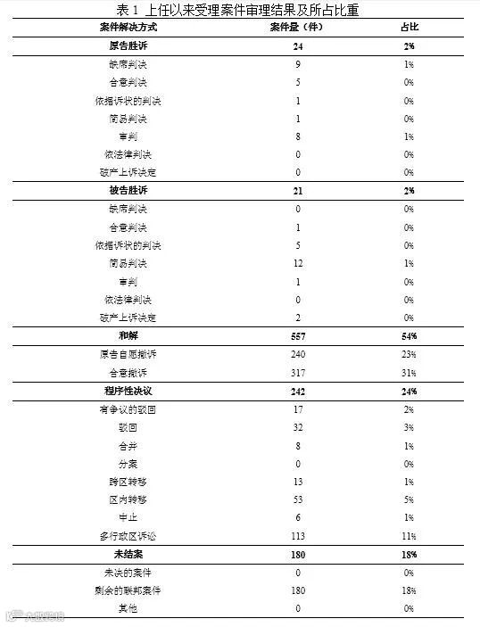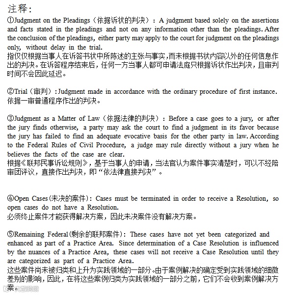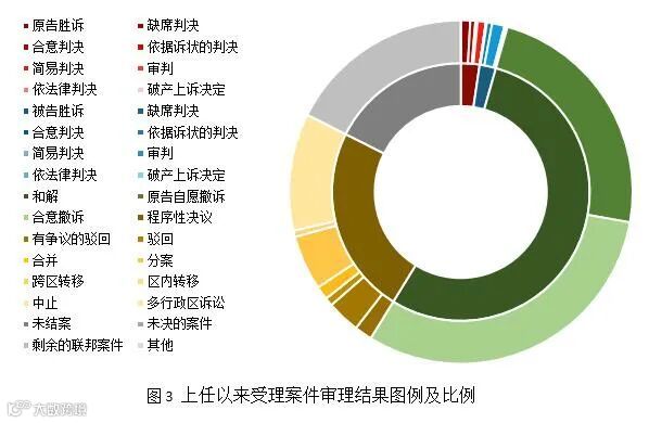 Albright法官负责审理的案件中,以和解结案的占54%,在程序性决议中有一半涉及多行政区诉讼。从判决结案的结果看,原告与被告的胜诉率相差较小。