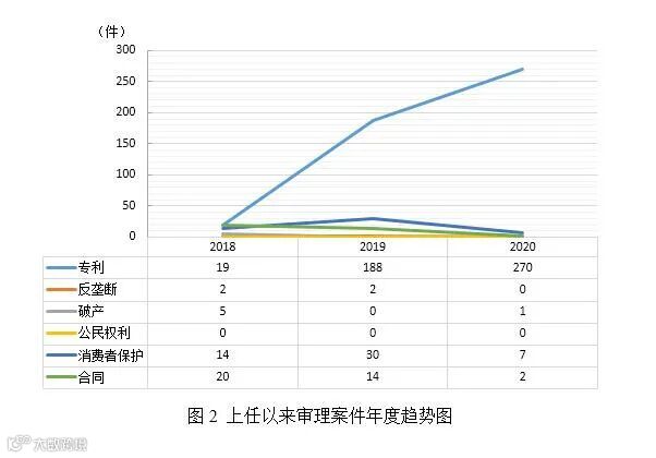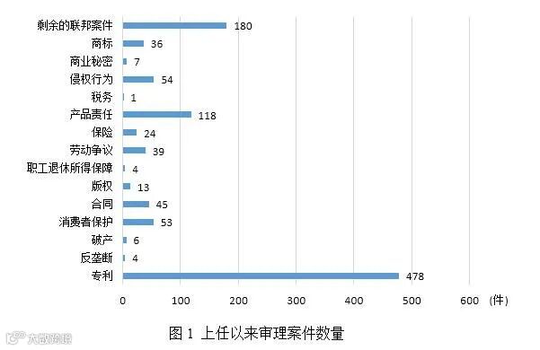 Albright法官审理的案件集中在在专利领域,2018年至2020年审理专利案件共478件。[1]此外,审理了产品责任案件118件。Albright法官上任以来,审理专利案件数量逐年增加。