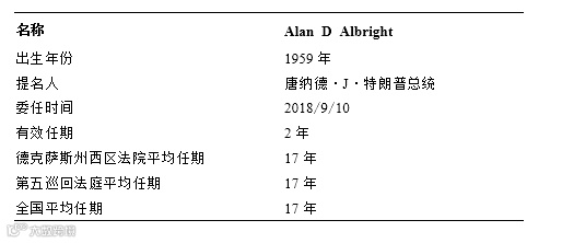 2018年9月,Albright就任德克萨斯州西区法院法官。其个人信息如下: