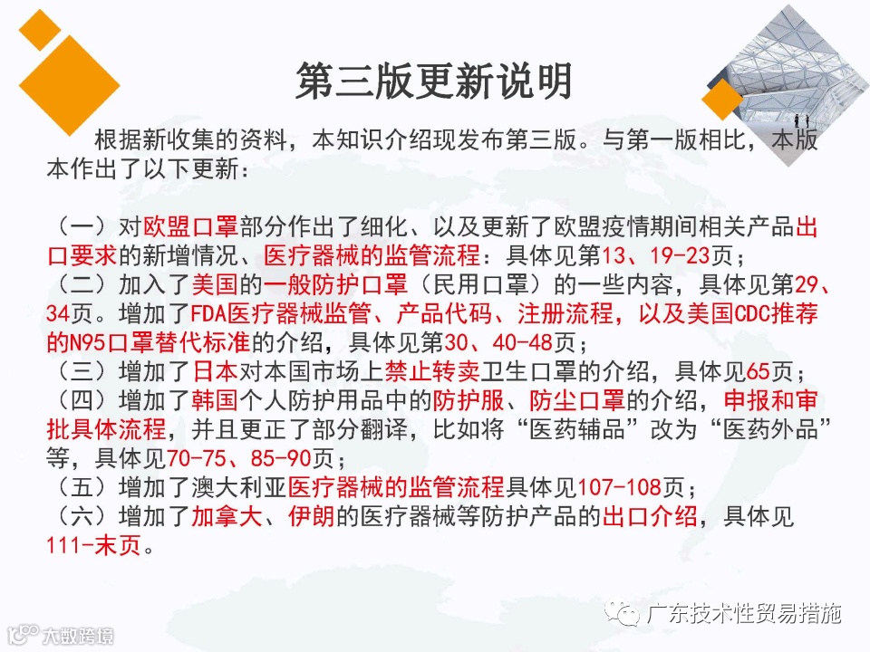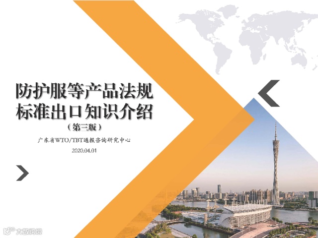 为帮助企业了解国外防护服、口罩等产品准入要求,我中心收集整理了相关资料并及时更新,形成《防护服等产品法规标准出口知识介绍》(第三版),供企业参考。由于时间仓促,对选编内容难免有不当之处,如有不当,敬请尽快与我们联系更正!