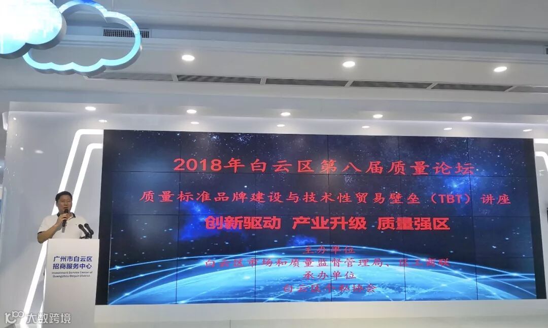 2018年5月24日上午,广州白云区第八届质量论坛在白云区招商服务中心举行,本次论坛由白云区市场和质量监督管理局、区工商联、区个私协会联合主办,论坛主题为“质量标准品牌建设与技术性贸易壁垒(TBT)讲座”。