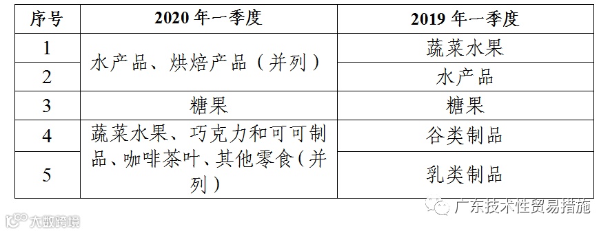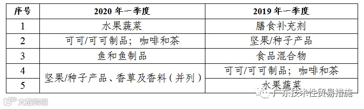 表1 2020年一季度FDA拒绝广东农食产品进口的前5类产品