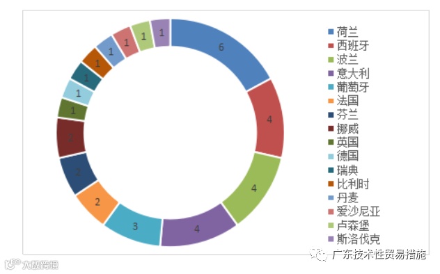 在通报国家方面,通报中国产食品最多的是荷兰,共通报6例,占中国产食品被通报总数的17.1%。其次为西班牙、波兰和意大利(详见表3、图3)。
