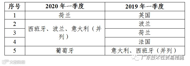 表3 2020年一季度RASFF通报中国产食品前5位国家列表