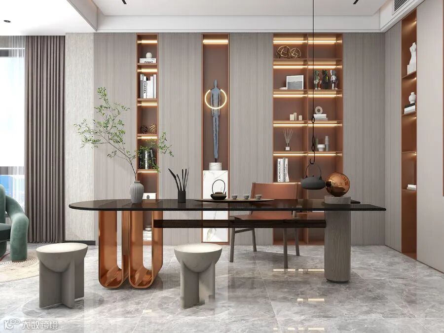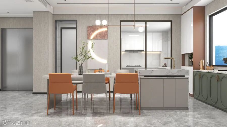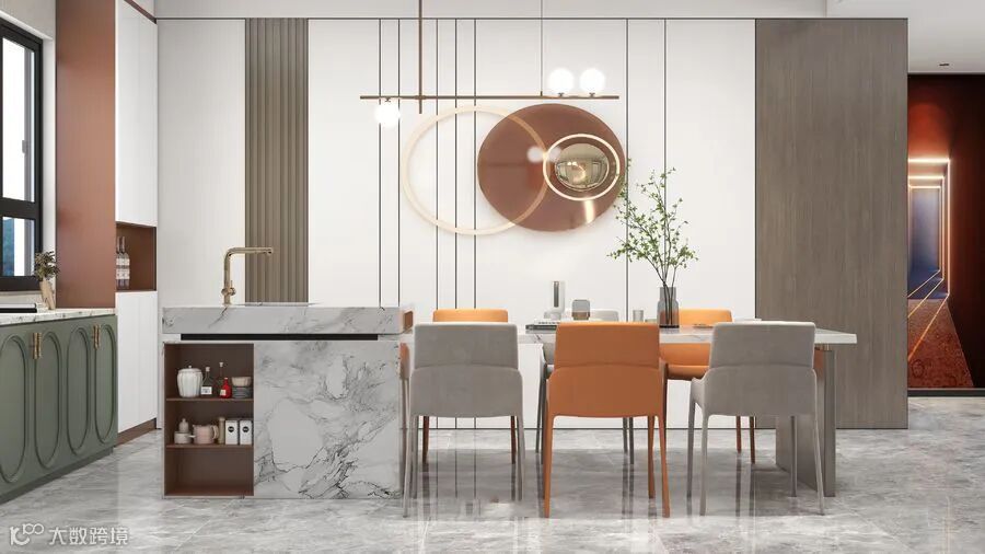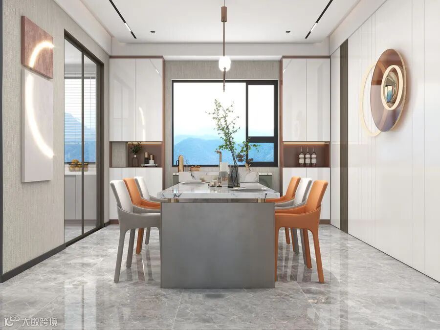 雅致的灰、温馨的橙与柔和的绿,将温柔的色彩自由挥洒在用餐空间,轻松的氛围无需言说。收纳柜布置在临窗一侧,满足日常收纳之余,也能留出更多的活动空间,使用餐动线清晰、空间氛围明快。